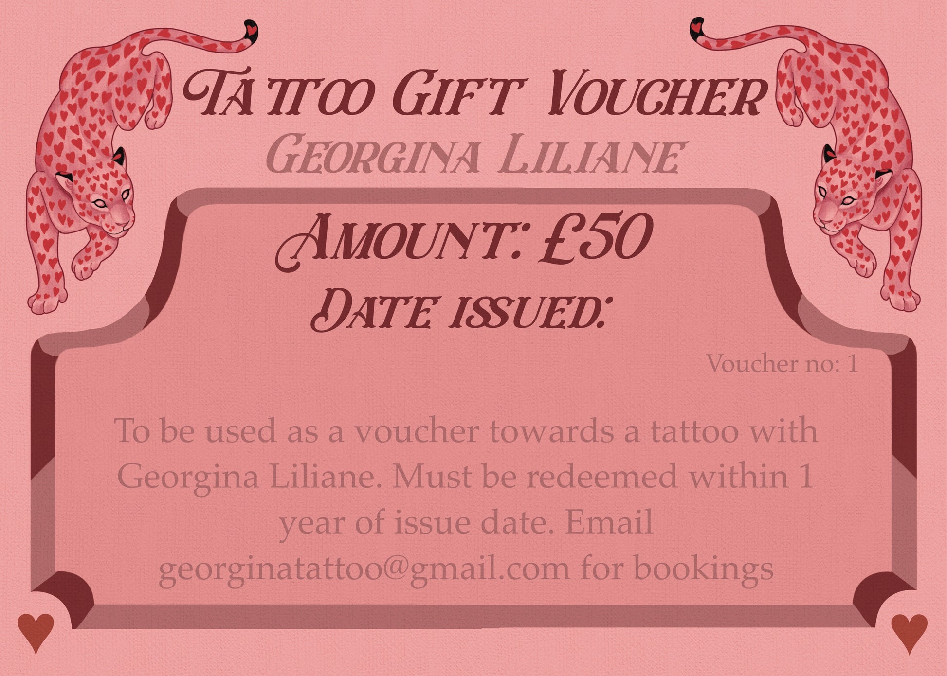 Tattoo E voucher to be redeemed with a tattoo from Georgina Liliane. E voucher will be sent to email address after checkout, available to forward with your own message or print from home.